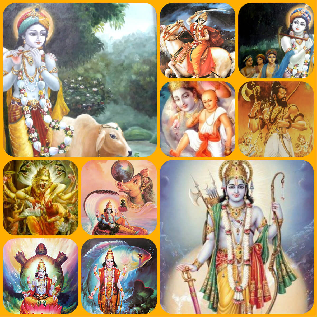 The most popular ten avatars are Matsya(Fish), Kurma (Turtle), Varaha (Boar), Narasimha (Lion Man), Vamana( The Dwarf), Parashurama, Rama, Balarama, Krishna, and Kalki.