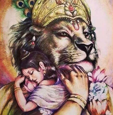 “With Narasimha there is no tomorrow, everything is instant. Put the switch on, the power is on. Narasimha wards off all kind of fear! He is a very powerful, precious avatar and is depicted as a great protector at the time of need. He has love and affection towards his Dharmic devotees, I believe, though he is ferocious towards Adharmics.”